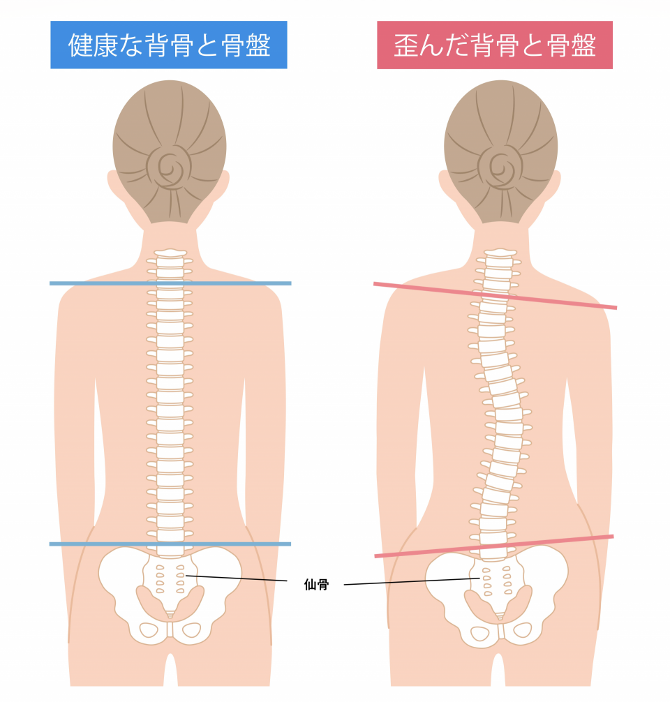 仙腸関節が、緩んだり、ズレてしまうと、関節の圧力が低下し「仙骨」(背骨の土台)の不安定性を生み背骨(脊柱)が傾いてしまいます。