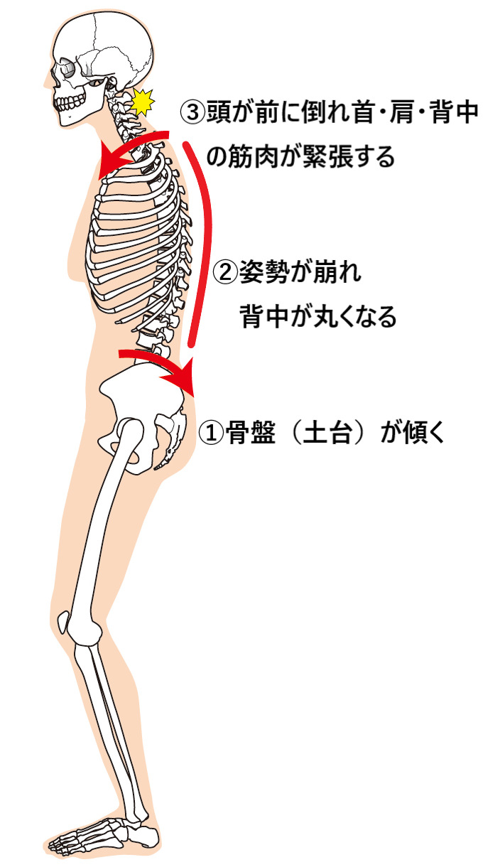 姿勢が崩れると首が前に出ることにより、重たい頭を支えなくてはならず、首や肩、背中の筋肉が緊張し、疲れて肩こりを引き起こします。